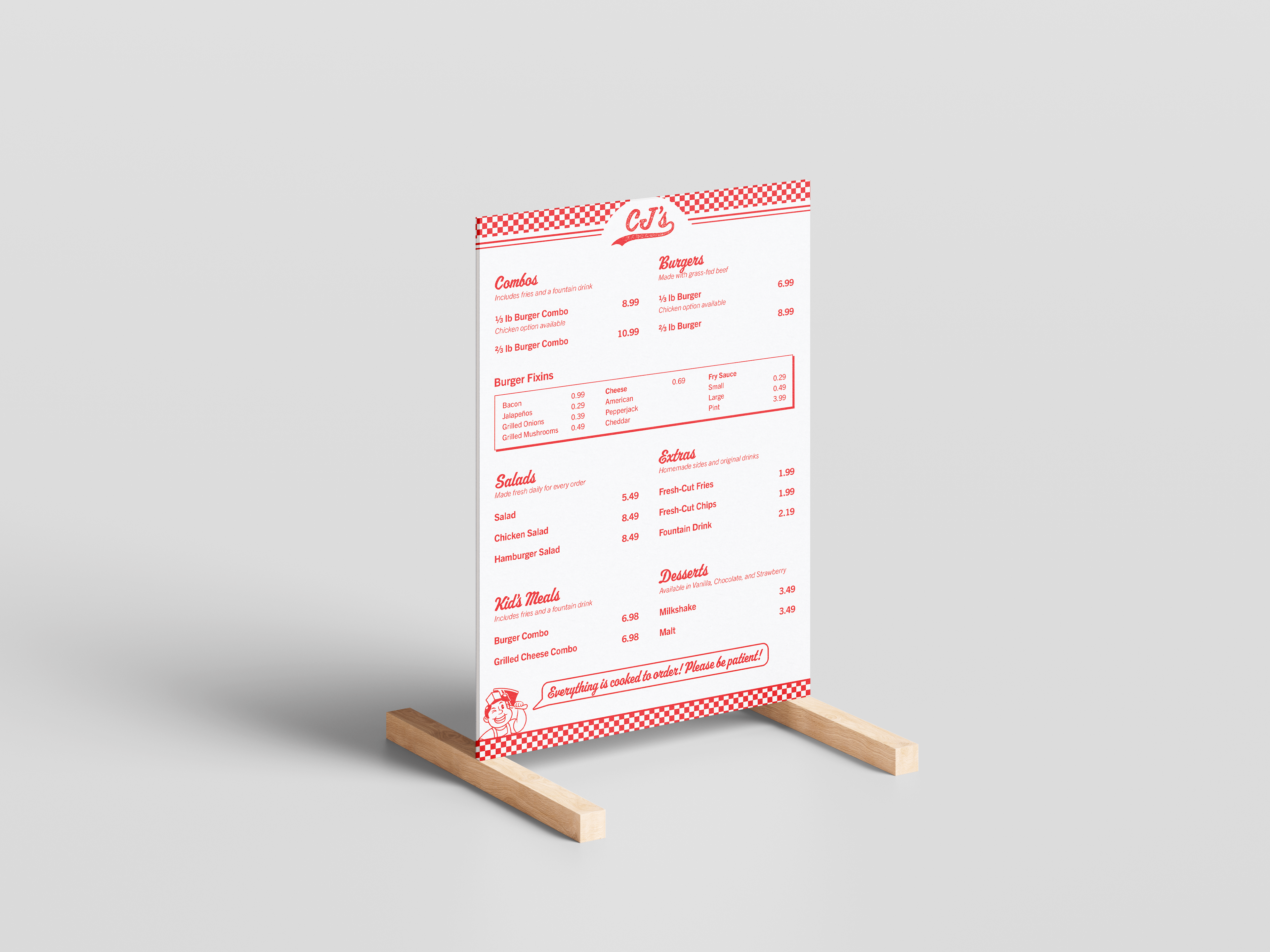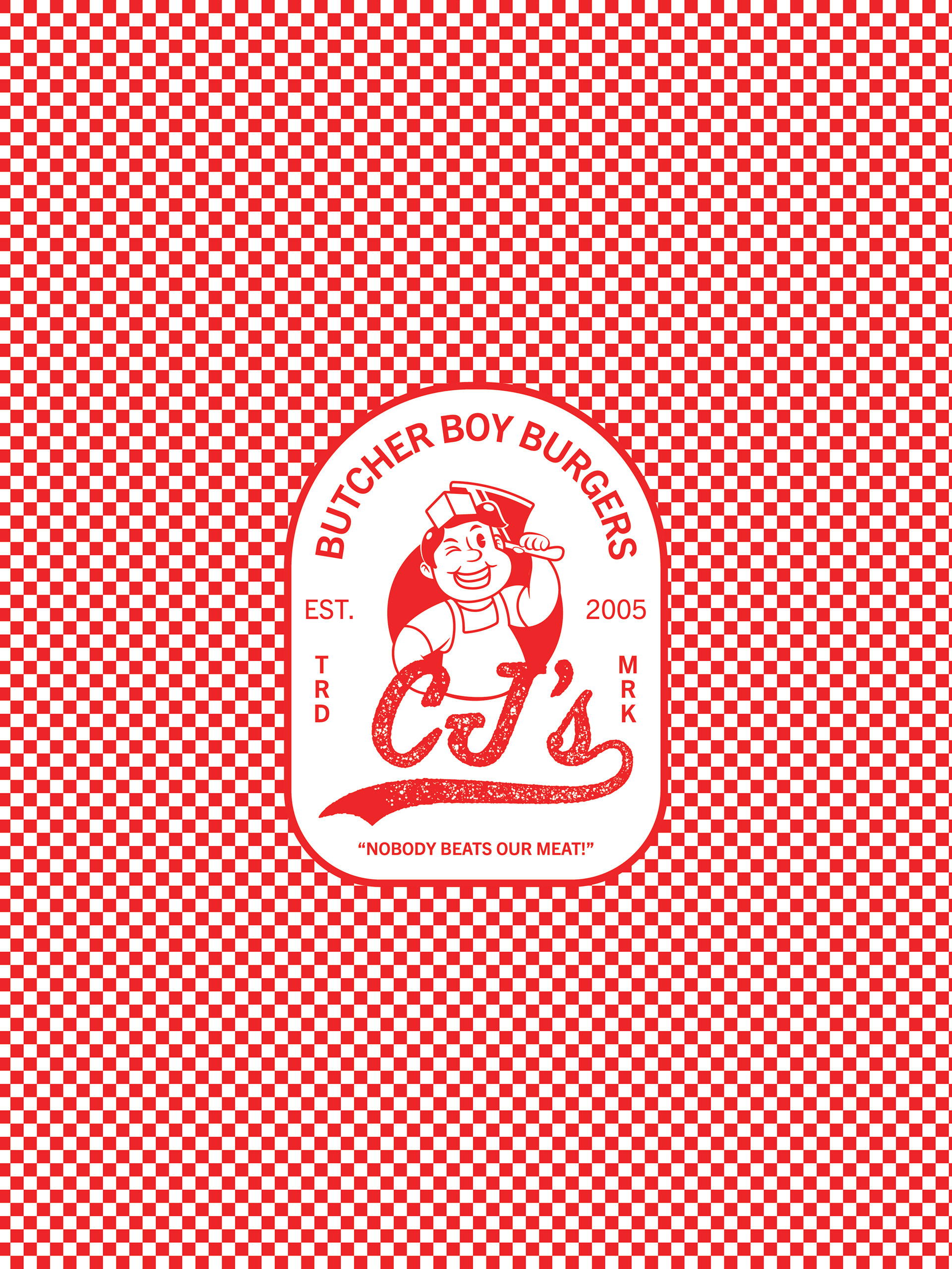 This menu redesign was created for CJ's Butcher Boy Burgers, a local restaurant based in Fayetteville, AR. The menu brings a playful, 1950s diner aesthetic to the restaurant's brand identity.